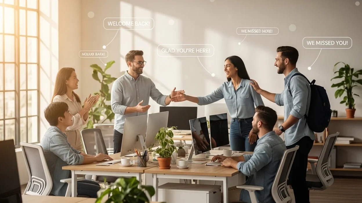 “Hey Sarah, glad you’re back! The office really missed your energy. It’s great to have you back on the team, and we’re excited to move forward together.”